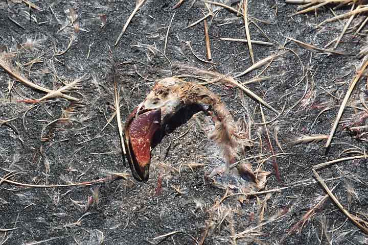 8. Tag Federn und andere Überreste zahlreicher Flamingos bilden am Ufer das Lake Nakuru inselartige Flecken, die aus der Ferne wie flache Strohansammlungen wirken. Die Marabus kümmern sich als Aasfresser um die Reste toter Artgenossen. |