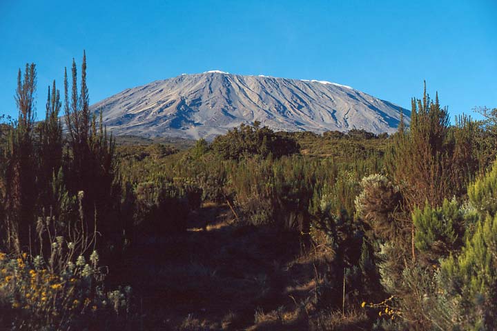 Der Kibo im klaren Morgenlicht. Die Vergletscherung des Kraterrandes ist von Norden nur als schmaler Saum zu erkennen.