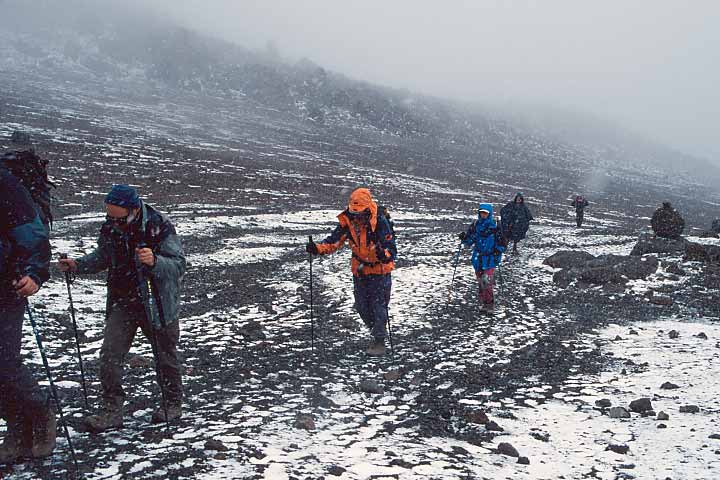 Von dem morgendlichen Prachtwetter ist nichts mehr übrig geblieben: Bescheidene Verhältnisse auf dem Weg zur School Hut.