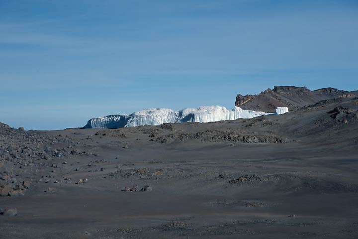 14. Tag Der Furtwangler Gletscher liegt wie ein mächtiger Eisberg auf dem Kraterboden. Er grenzt mit seinem linken (westlichen) Rand an die Western Breach, ohne jedoch heute noch über die Kante hinabzufließen. Aufnahmestandpunkt: (Ungefähr) Stella Point, 5745m. |