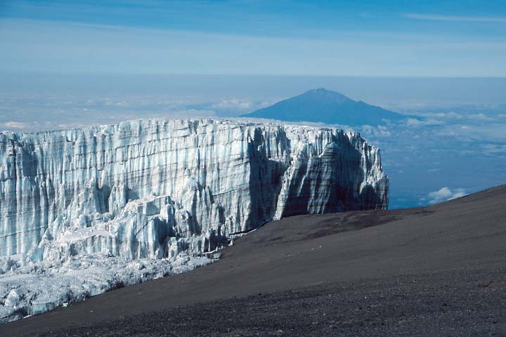Kurz vor dem Erreichen des Uhuru Peak wird der Kersten Gletscher, einer der größeren südseitigen Gletscher, sichtbar. Darüber der Mt. Meru (4566m), dessen Besteigung eine beliebte Eingehtour für den Kilimandscharo ist.