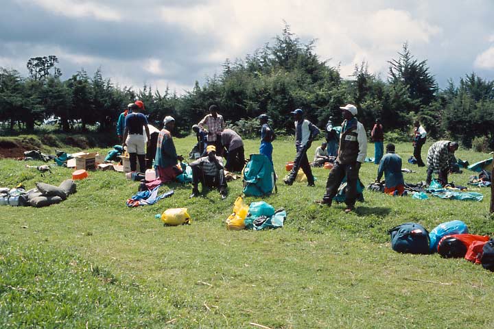 Das Gepäck wird auf die Träger verteilt. Jeder trägt 8 kg persönliches Gepäck der Teilnehmer und dazu sonstige Ausrüstung.