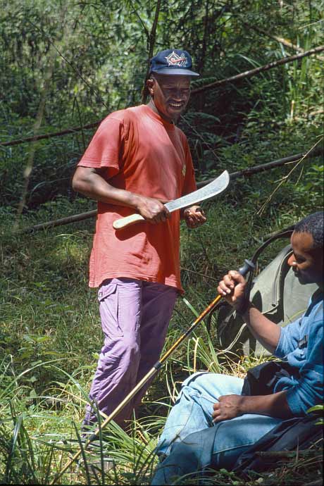 Kurze Rast bei der Wanderung durch den Bambuswald. Unsere Führer Alex und Willie.