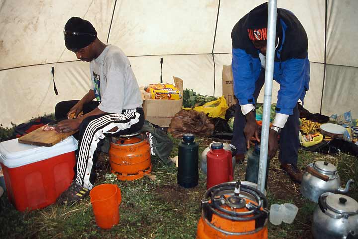 Essenszubereitung im Küchenzelt, das abends auch als Speisesaal diente.