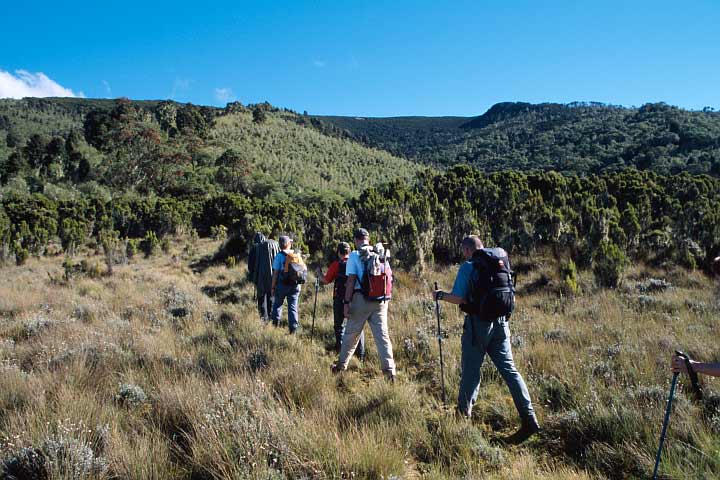 Nach Überwindung der Steilstufe oberhalb des Sagana River Camp führt der Pfad durch eine buschbestandene Graslandschaft