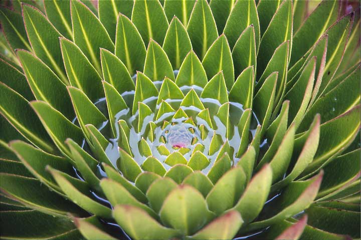 Mit ihrer raffiniert verschachtelten Anordnung halten die harten Blätter der Lobelie das Regenwasser erstaunlich gut fest.