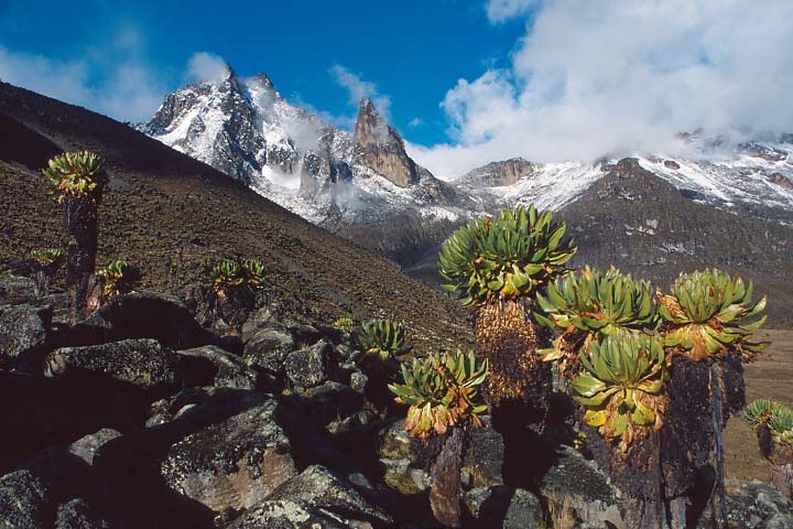 Sonnenschein an der Teleki-Hütte. Der Pt. Lenana verbirgt sich noch links in den Wolken.