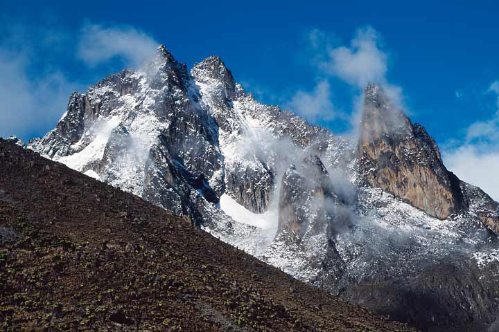 5. Tag Der Hauptgipfel des Mt. Kenia mit Batian (5199m), Nelion (5188m) und Pt. John (4883m). Die vom Hauptgipfel herunterziehende Licht-Schatten-Grenze markiert das Diamond-Couloir, eine leider zunehmend ausapernde, schwierige Eiskletterroute. |