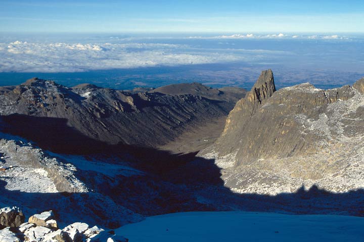 6. Tag Das nach Westen führende Teleki-Tal. Im Talboden ist wenig unterhalb der Bildmitte als kurzer heller Strich die Teleki-Hütte, unser Ausgangspunkt, zu erkennen. Rechts darüber der Point John. |